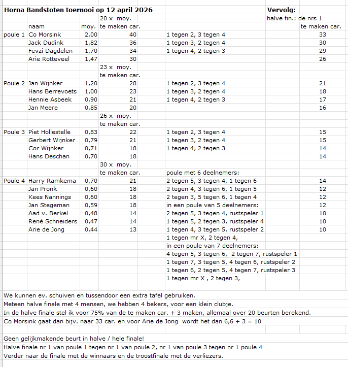 poule 1: Co Morsink; poule 2: Hans Berrevoets; poule 3: Hans Deschan en poule 4: Aad van Berkel.