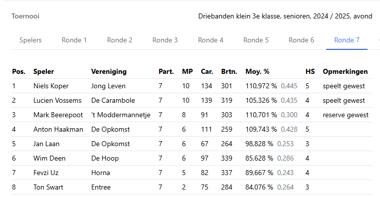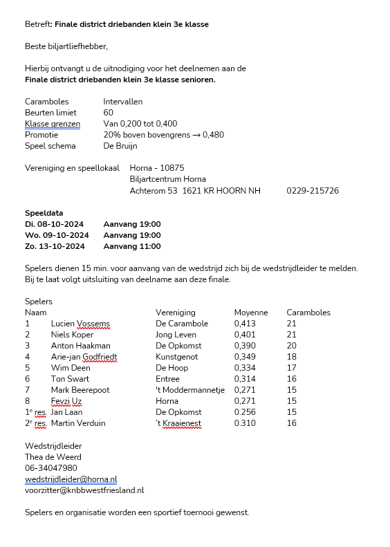 Zondag 20 oktober as. het Horna-driebandentoernooi