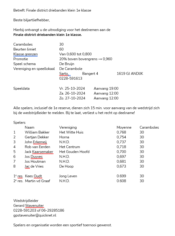 Districtsfinale driebanden klein 1e klasse, 25 t/m 27 oktober