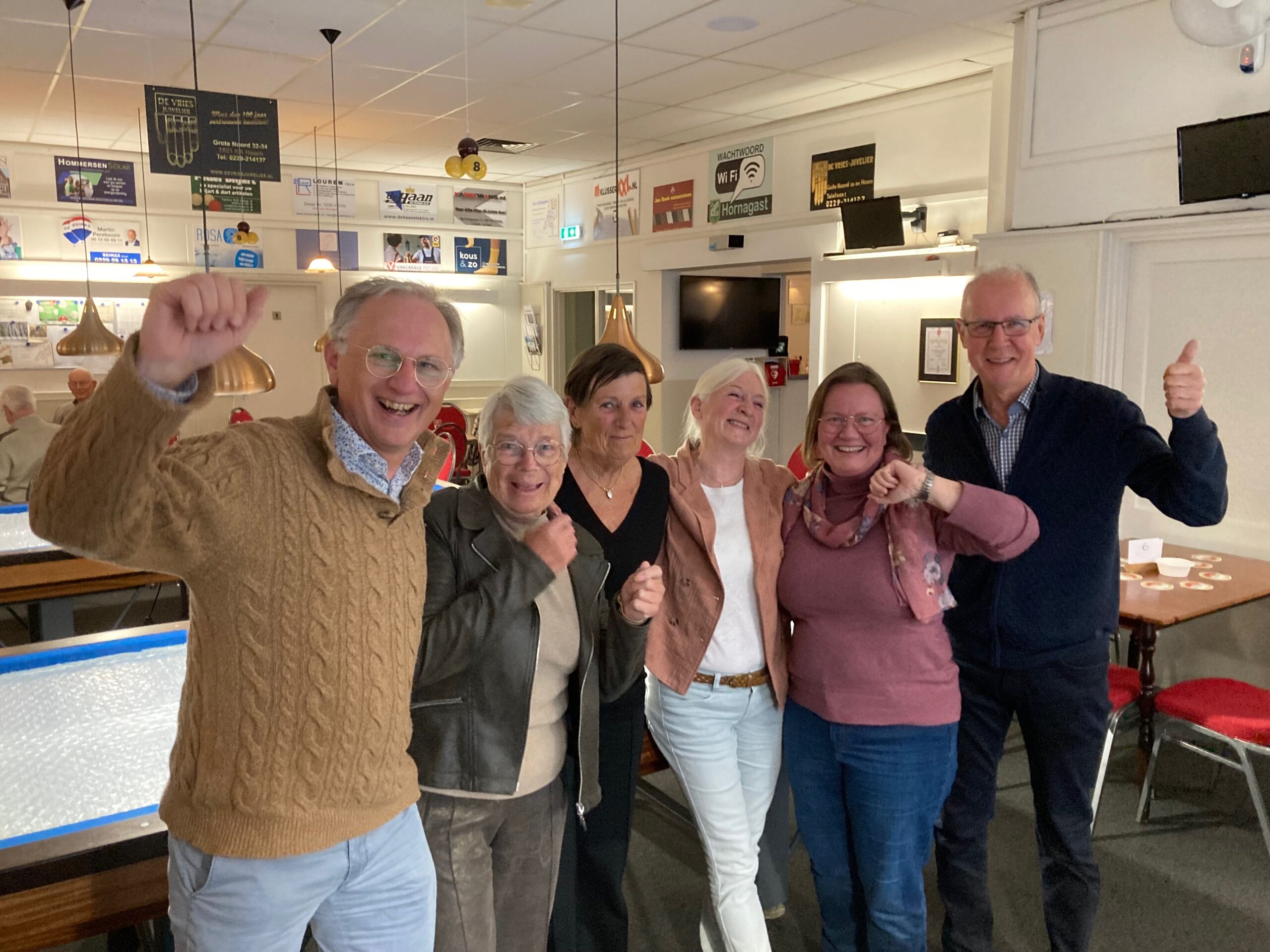 Zondag 13 oktober, de finaledag van het driebanden 3e klasse klein. Vanaf ronde 3 ging Lucien Vossems aan kop. Mark Beerepoot en Anton Haakman konden nog het beste volgen. Dit terwijl Niels Koper ronde 1 en 2 nog puntloos was. Vanaf ronde 3 ging Niels los zullen we maar zeggen. Daarna schoof hij elke ronde een plaatsje op. Na ronde 6 stond Lucien nog steeds bovenaan met 10 punten. Niels was echter dichterbij geslopen en had inmiddels 8 punten. Het ging dus om de laatste ronde. Deze ging tussen Lucien en Niels. Niels won, kwam ook op 10 punten en door een beter moyenne werd hij kampioen. Mark Beerepoot werd 3e in deze spannende ontknoping. Onze eigen Fevzi Uz kon in deze finale geen potten breken en werd 7e. Eindelijk was het dan weer zover, de dag dat we de Horna-vrijwilligers bedanken voor hun inzet. Hart voor Horna noemen we deze dag. Eigenlijk zijn deze vrijwilligers het Hart van Horna. We kunnen nu eenmaal niet zonder hen. Zo’ n 50 mensen – zonder of met partner – waren zaterdagmiddag 12 oktober hier op afgekomen. Na binnenkomst kopje koffie, thee werden ze door Irma en Jos in 10 verschillende groepen ingedeeld. Irma had een quiz gemaakt met 60 verschillende vragen. Makkelijke vragen, maar ook behoorlijk moeilijke (Telefoons weg natuurlijk). Hapje en drankje tussendoor en quizzen maar. Nadenken, overleggen in de groep en na snel invullen, en …. volgende vraag. Terwijl Irma de eindstand berekende begeleidde Jos de groepen naar gereedstaande spellen. In groot formaat stonden ‘4 op een rij’, ‘het spiraalspel’ en een ‘sjoelbak met een hoek’ opgesteld. Ook hier werd fanatiek gespeeld. En ja, dan eindelijk door Irma het verlossende woord. Bij een quiz kan er maar eentje de winnaar zijn, en dit was De Schildpadden. De dag werd afgesloten met een heerlijk koud- en warm buffet. Irma en Jos hartelijk dank voor jullie inzet, het was grandioos! En op zo’n dag blijkt weer eens te meer dat we niet zonder de inzet van de kantinedames kunnen. Dank weer voor jullie tomeloze inzet! Na afloop werd met man en macht onze biljartzaal weer netjes gemaakt omdat de dag erna de finaledag van de 3e klas driebanden klein op het programma staat. Hieronder een sfeerimpressie. Vrijdag 11 oktober jl. was weer de jaarlijkse sportoriëntatiedag van de OSG-West-Friesland. De organisatie had weer een dag vol verschillende sporten georganiseerd. Van boksen, schermen, tennis, paddel, kickboksen, salsadansen tot …. jawel BILJARTEN! 45 leerlingen hadden zich hiervoor aangemeld in een ochtend- en een middagsessie. Sommigen hadden nog nooit een biljart van dichtbij gezien. Wel een pooltafel uiteraard. Een enkeling had een ouder die biljartte of gebiljart had. Na de grondbeginselen uitgelegd mochten ze in verschillende groepjes zelf aan het werk. Een aantal werd na een tijdje zelfs heel fanatiek. Is er zicht op toename van jeugdleden? We wachten in spanning af. De begeleiders Aad, Arie, Bert, Dick, Herman Jack en Gerbert hebben hun best gedaan. Er gaan stemmen op om het zondagochtendbiljarten weer op te pakken. Een paar jaar geleden zijn we hiermee gestopt omdat de belangstelling hiervoor terugliep. Voordat we dit opnieuw leven in blazen, willen we eerst inventariseren of hier wel voldoende belangstelling is. Op het publicatiebord in de biljartzaal hangt een inventarisatielijst. Belangstelling? Schrijf je naam erop en we komen hier dan binnenkort op terug. En o ja, het tijdstip van het zondagochtendbiljarten is van 10.00 – 13.00 uur. U heeft het vast al wel gelezen in onze Nieuwsbrief dat we zondag 20 oktober het jaarlijkse Horna driebandentoernooi organiseren. Een gezellige dag waarin Horna-leden de strijd met elkaar aangaan. Of u nu een geoefende speler bent of een beginneling het maakt niet uit, u wordt ingedeeld naar kunnen; kortom een eerlijke strijd. Kortom, schrijf je in, de lijst hangt op het publicatiebord.