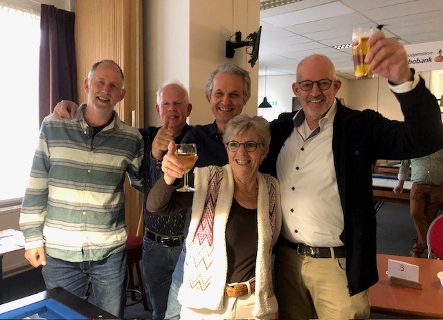 Intussen waren ook de kleinkinderen (Xavi en Zoë) van Loe gearriveerd en dat gaf opa zichtbaar een boost. Het eerste slachtoffer werd Martin. Jan won van Arnold zodat de uiteindelijke finale Loe tegen Jan werd. Loe was compleet los en won de 2 finale partijen met een moyenne van ruim 1. Een meer dan terechte winnaar! Jan werd dus 2e, Arnold 3 en Martin 4.